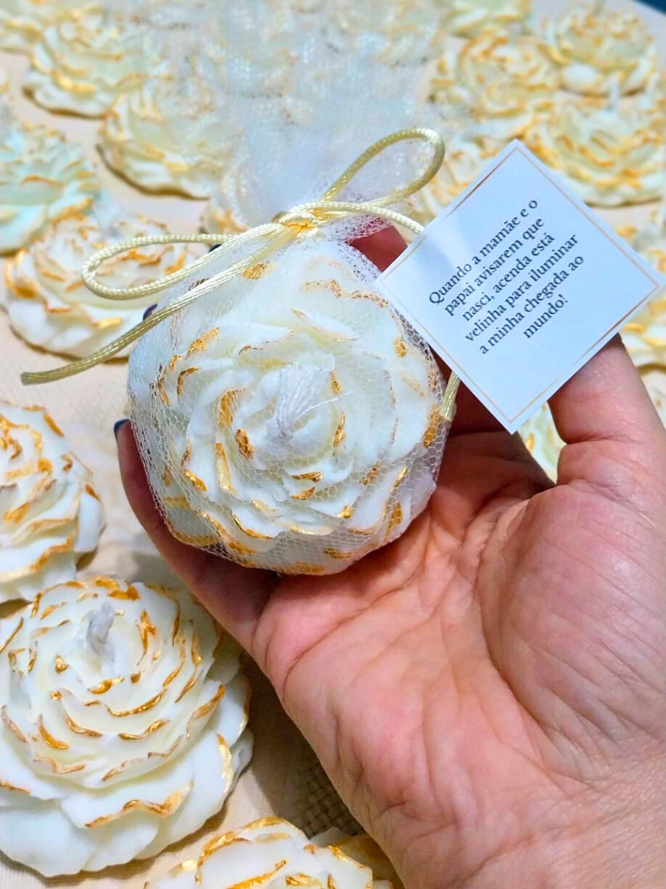 Vela aromática de 70gr embalada em saquinho de Organza + Tag (etiqueta personalizada).